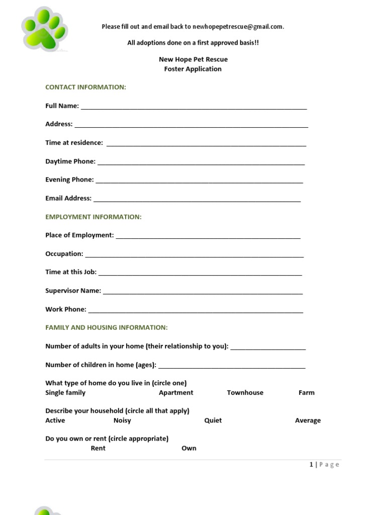 If you are interested in adopting a dog/puppy from new hope pet rescue please fill this application out and email it back to newhopepetrescue@gmail.com.